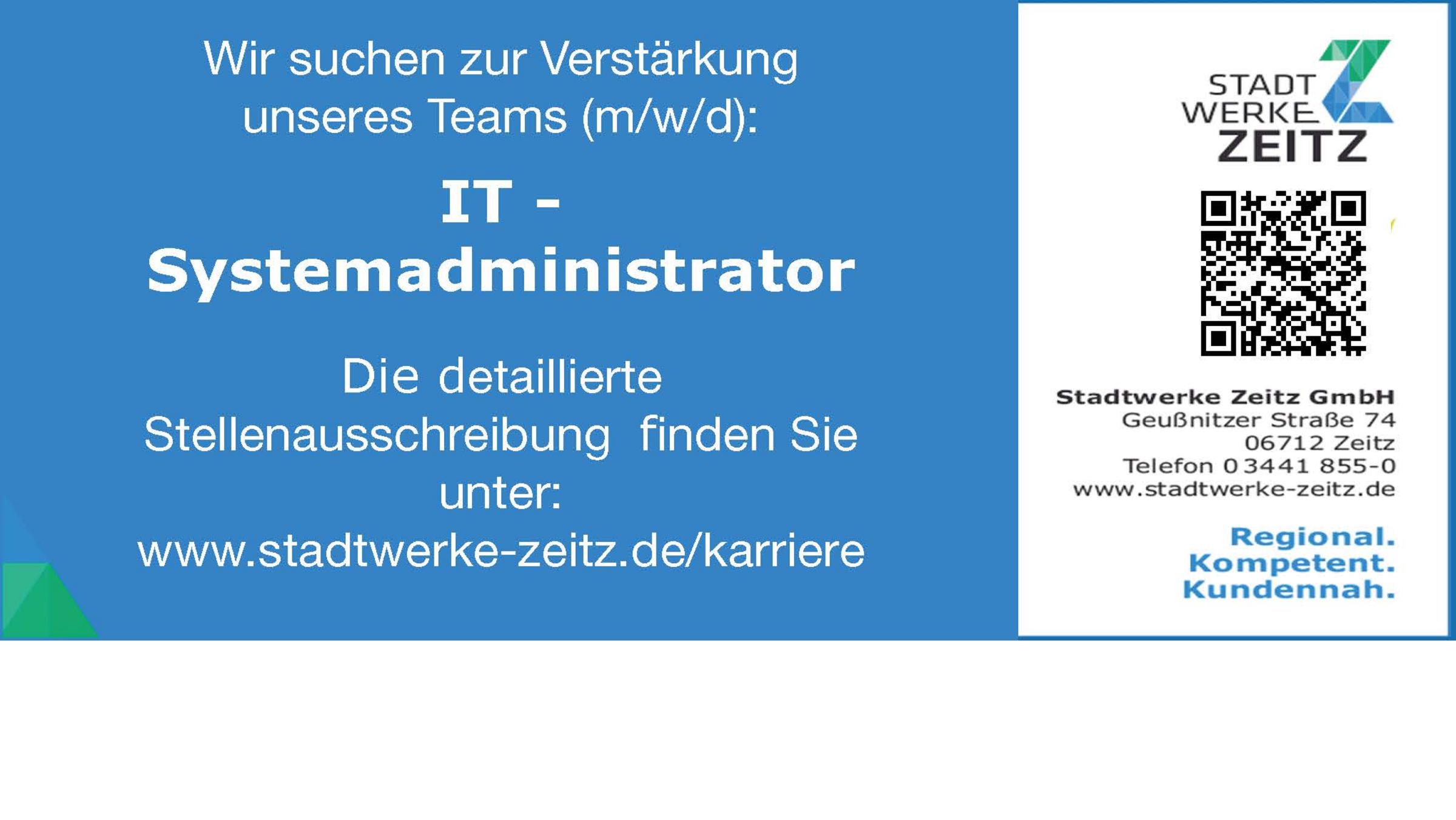 IT - Systemadministrator gesuchtKarriere16.05.202415:48 UhrEs gibt wieder eine interessante Stelle bei uns zu besetzen.www.stadtwerke-zeitz.de/karriere