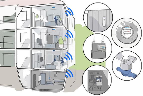 Die Messtechnik funkt an die Gateways, welche im Haus installiert sind. Von dort aus werden die Daten in das Abrechnungsprogramm der Stadtwerke übertragen.